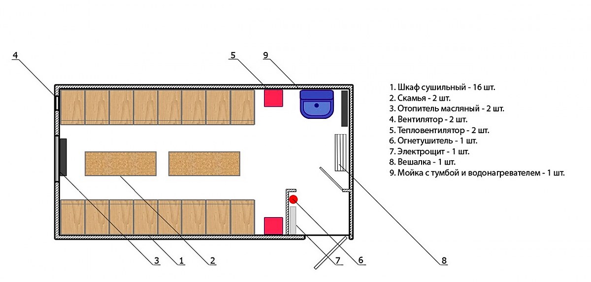Сушильные шкафы расположены симметрично, по 8 штук, у противоположных 6-метровых стен. В пространстве между рядами шкафов закреплены скамейки.